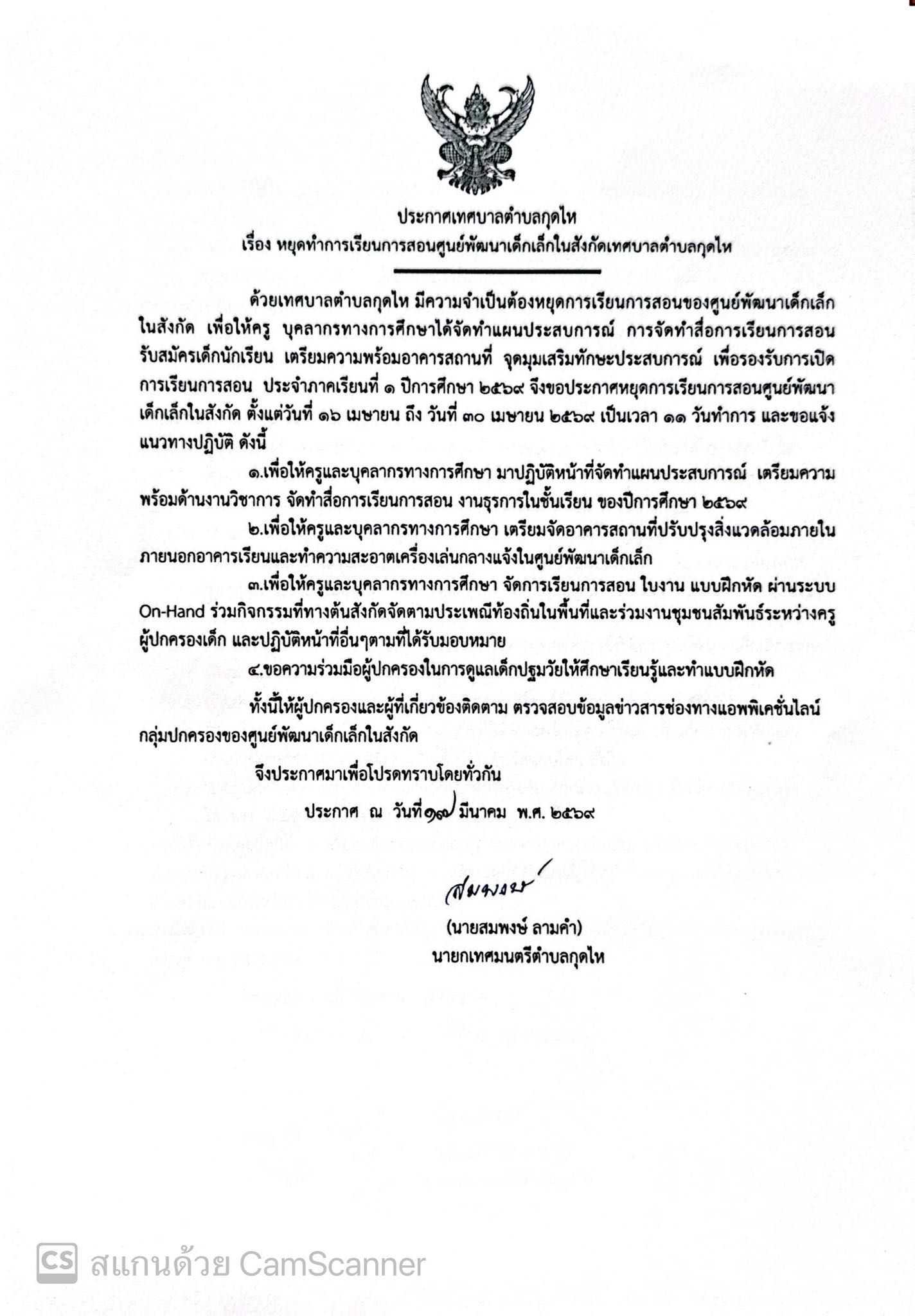ประกาศหยุดการเรียนการสอนศูนย์พัฒนาเด็กเล็กในสังกัดเทศบาลตำบลกุดไห